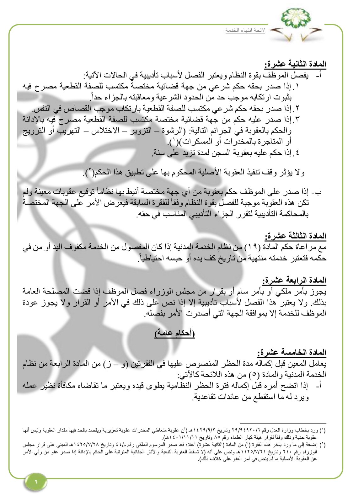 أوضحت وزارة العمل أن فسخ العقد بين الموظف وصاحب العمل يتم وفق المواد المنصوص عليها في المادة 80 من نظام العمل. غياب 15 يوم متصل يتم فصل الموظف بناء على المادة 80 من قانون العمل السعودي ويخطر الموظف بذلك بعد مرور 10 ايام. نموذج انذار موظف بسبب الغياب نموذج انذار موظف بسبب الغياب doc نموذج انذار موظف doc نموذج انذار موظف بسبب التأخير نموذج انذار موظف بالانجليزي نموذج قرار فصل نهائي نموذج انذار غياب موظف doc نموذج انذار موظف word نموذج لفت نظر pdf. 2 عدم اللياقة صحيا وهذا الأمر يقوم بتحديده المجلس الطبي المختص حيث لا يجوز فصل الموظف الغير لائق صحيا قبل إنهاء أجازاته المرضية والاعتيادية ولكن في جميع الأحوال في حال ثبوت تعاطي الموظف للمخدرات.