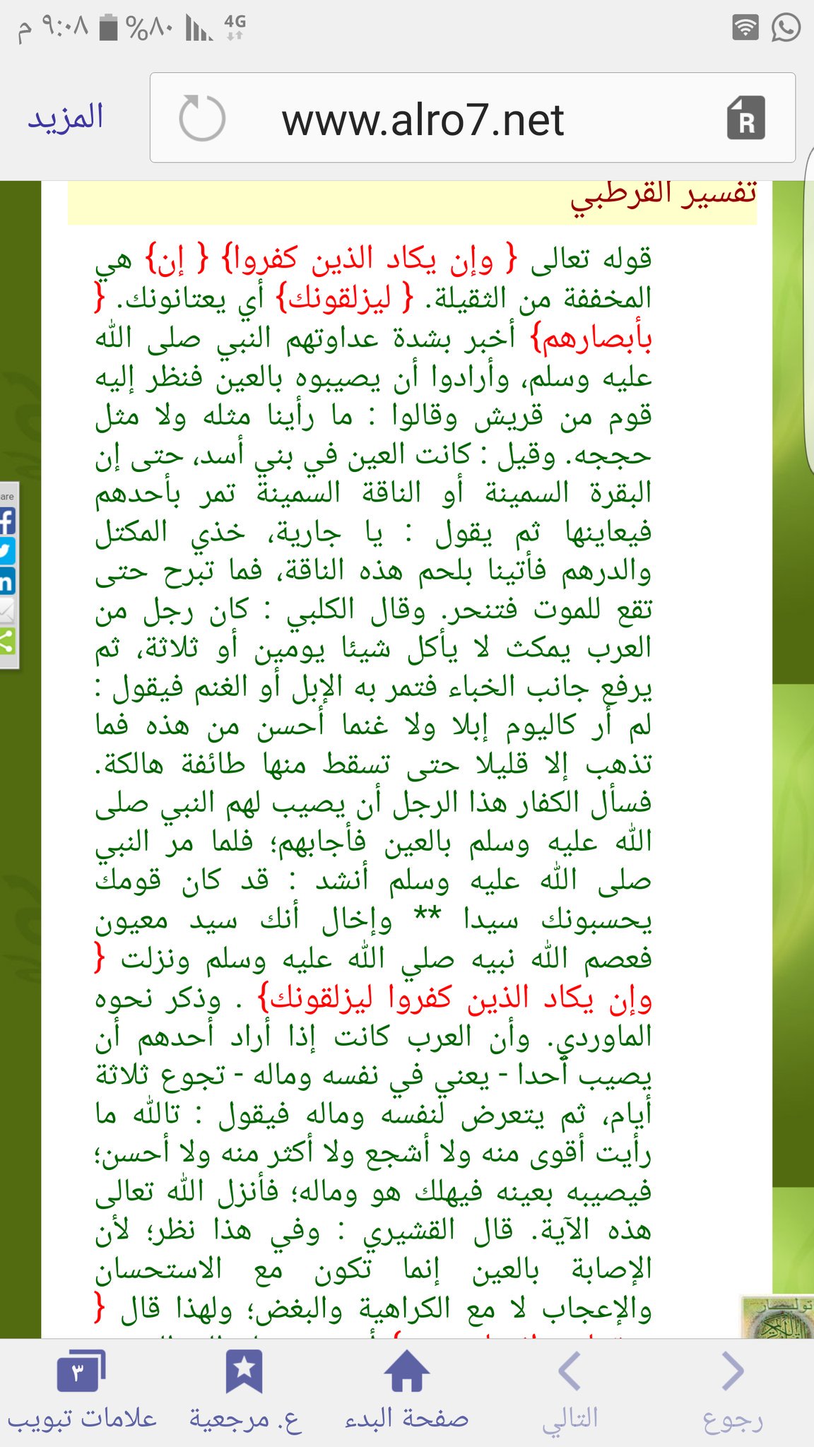 بأبصارهم أخبر بشدة عداوتهم النبي صلى الله عليه وسلم وأرادوا أن يصيبوه بالعين فنظر إليه قوم من قريش وقالوا. اللهم صل على محمد وآل محمد الطيبين الطاهرين بسم الله الرحمن الرحيم السلام عليكم ورحمة الله وبركاته قال تعالى. ليزلقونك أي يعتانونك. و إ ن ي ك اد ال ذ ين ك ف ر وا ل ي ز ل ق ون ك ب أ ب ص ار ه م يقول جل ثناؤه.