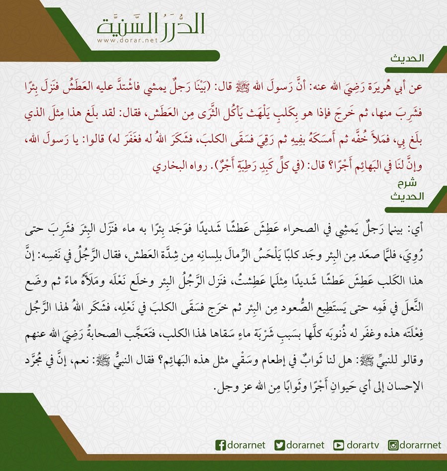 في كل كبد رطبة أجر. بينما رجل يمشي فاشتد عليه العطش فنزل بئرا فشرب منه ثم خرج فإذا هو بكلب يلهث يأكل الثرى من العطش فقال. من الغذاء والعلاج الدائمين أو ان يتم تسريحها بحديقة الدندر وفي كل كبد رطبة أجر بحسب الحديث الشريف. الاعجاز العلمي 0 التعليقات عن أبي ذر رضي الل ه عنه أن رسول الل ه قال.